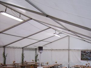 Standardbeleuchtung im Festzelt ist die Feuchtraumneonlampe. Sie ist mit zwei Neonröhren ausgestattet und hat einen Schukostecker und eine Schukobuchse. Die Lampen können somit untereinander verbunden und verlängert werden.