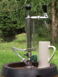 Mit der Handpumpe kann ohne Strom und Kohlensäure Bier aus dem Fass gezapft werden.
